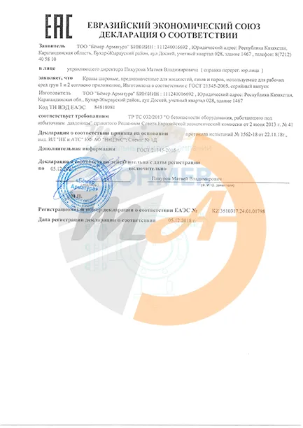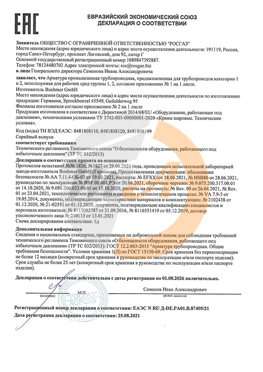 Декларация ТР ТС 032/2013, Шаровые краны Bohmer, Бёмер