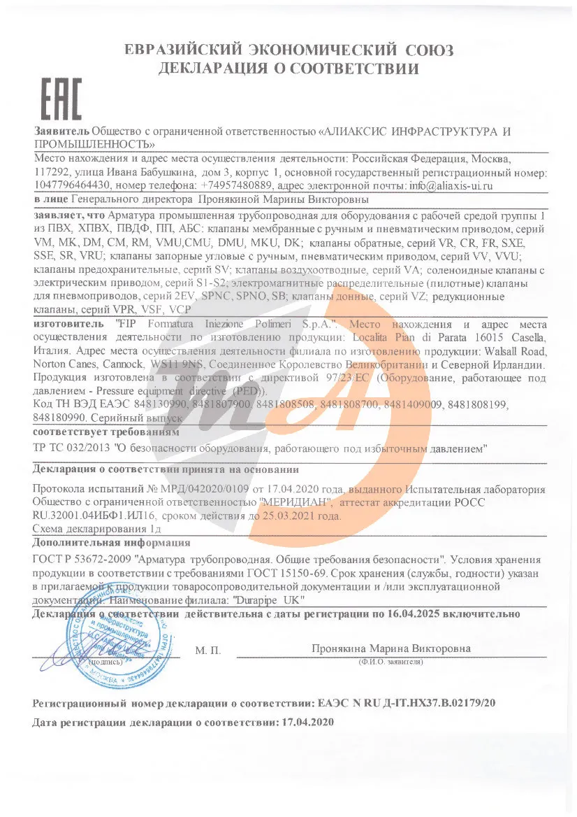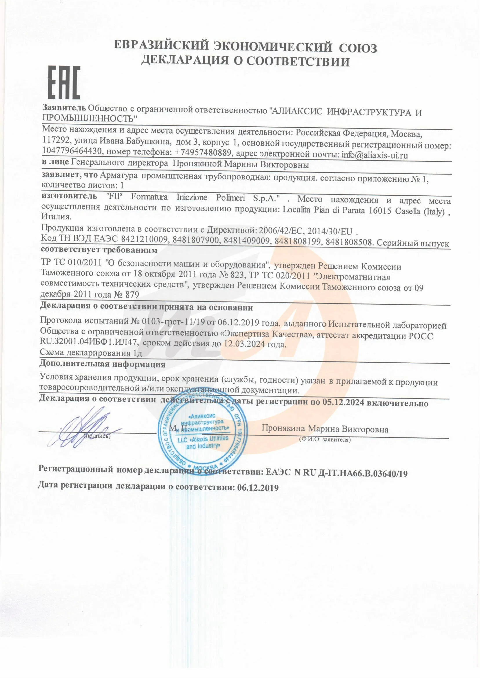 Декларация ТР ТС 032/2013, FIP, Арматура промышленная