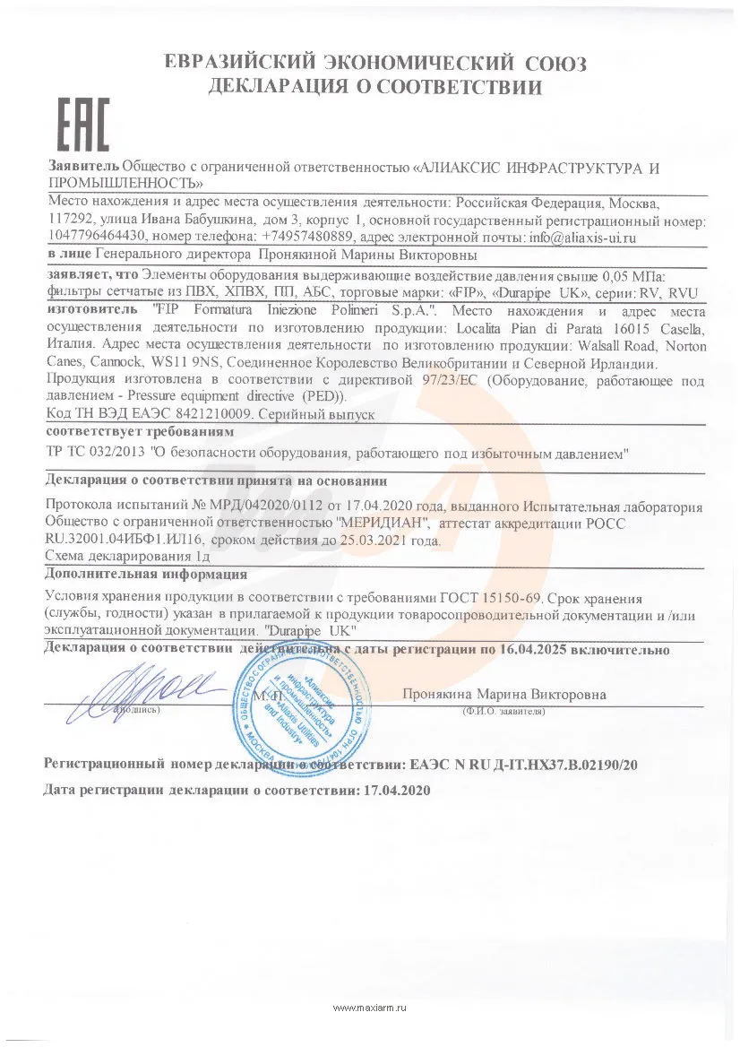 Декларация ТР ТС 032/2013, FIP, Фильтры ПВХ, ХПВХ, ПП, ABS